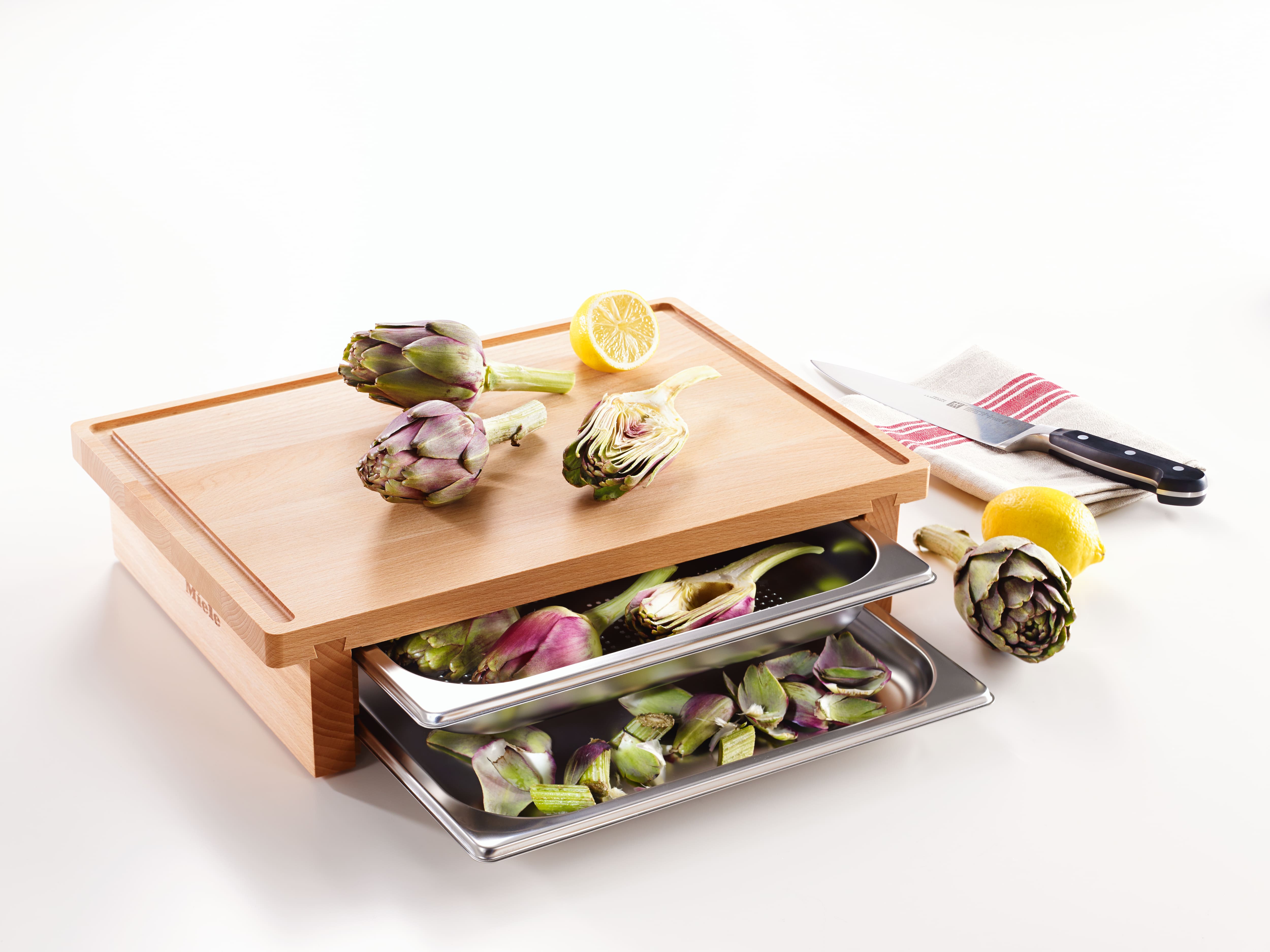 Разделочная доска с двумя вставленными контейнерами для пароварки.